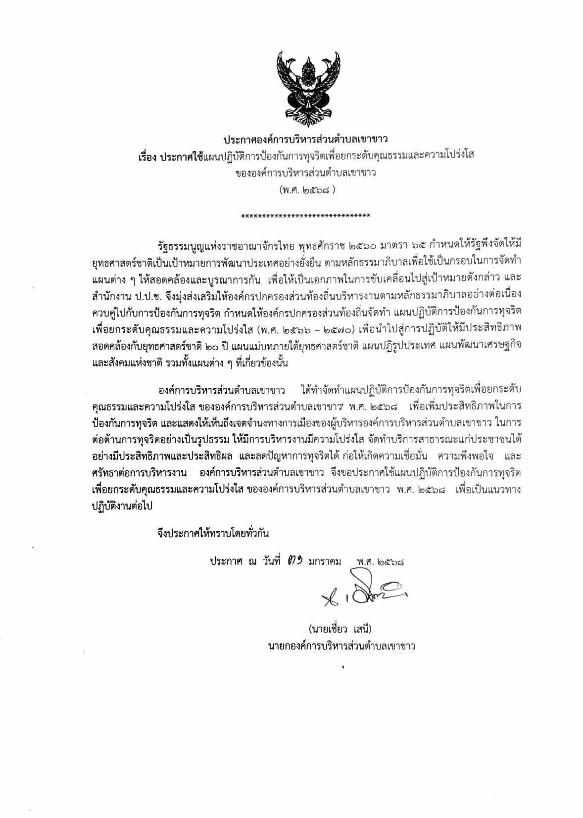 ประกาศ ใช้แผนปฏิบัติการป้องกันการทุจริตเพื่อยกระดับคุณธรรมและความโปร่งใส ของ อบต.เขาขาว (พ.ศ.2568)