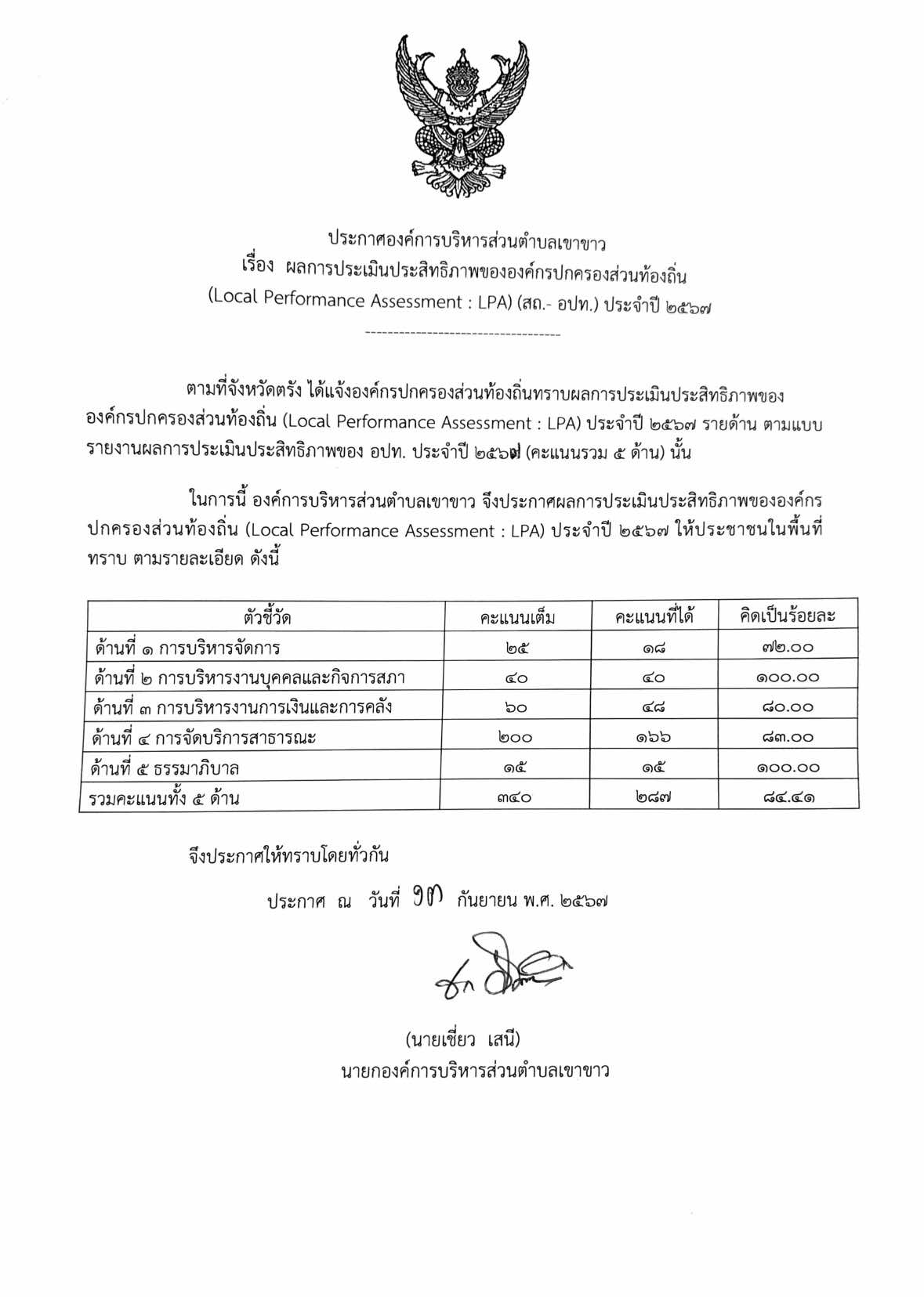 ประกาศ เรื่องผลการประเมินประสิทธิภาพขององค์กรปกครองส่วนท้องถิ่น (LPA) ประจำปี 2567