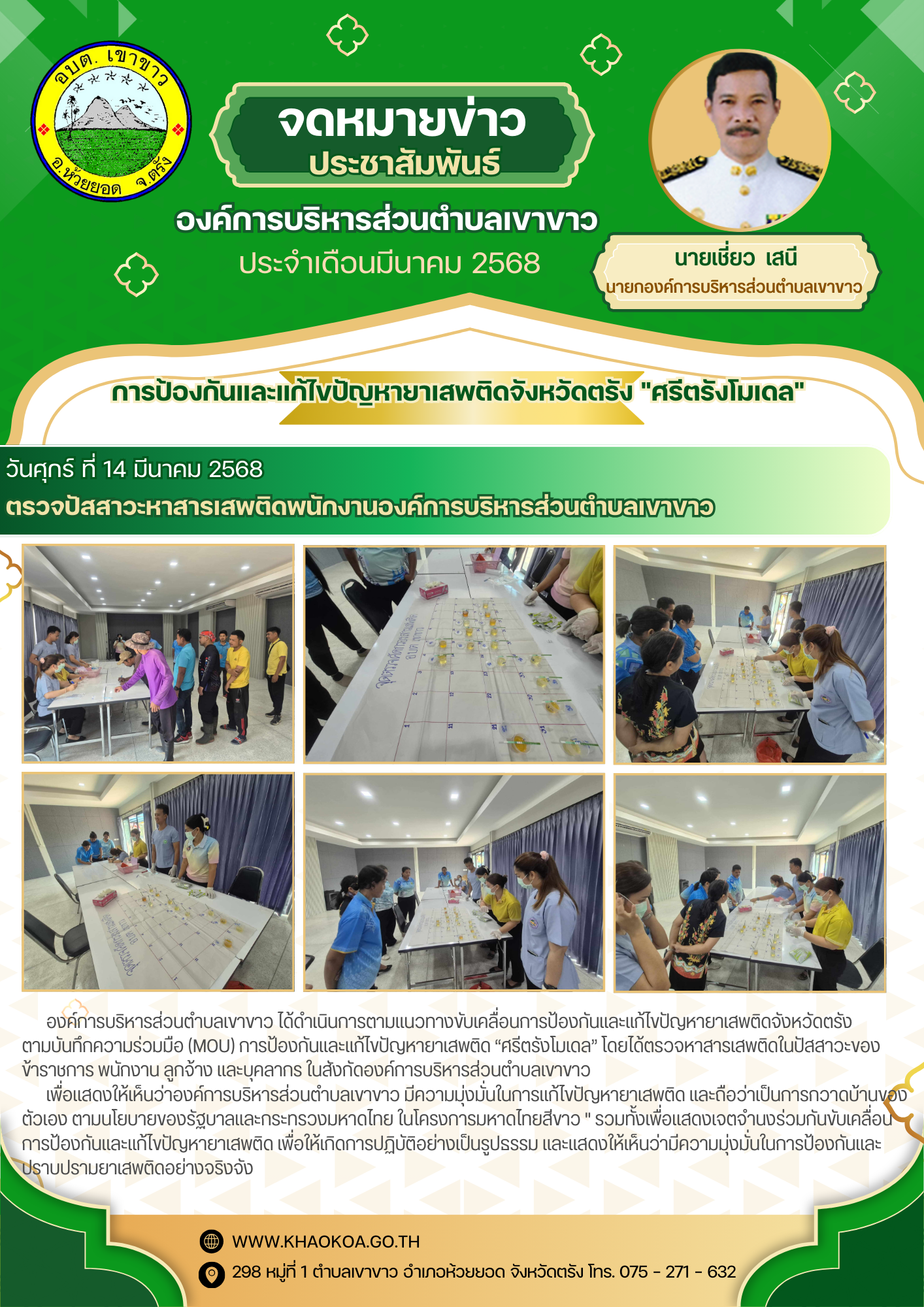 -องค์การบริหารส่วนตำบลเขาขาว ได้ดำเนินการตรวจปัสสาวะหาสารเสพติด ข้าราชการ พนักงาน ลูกจ้าง และบุคลากร ในสังกัดองค์การบริหารส่วนตำบลเขาขาว ในการป้องกันและแก้ไขปัญหายาเสพติดจังหวัดตรัง "ศรีตรังโมเดล"