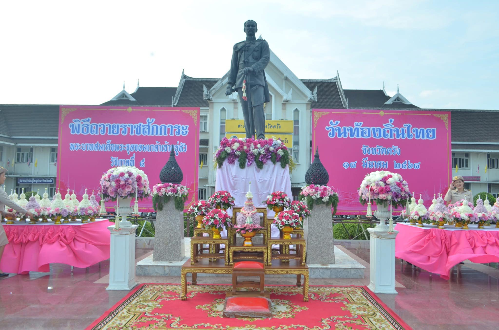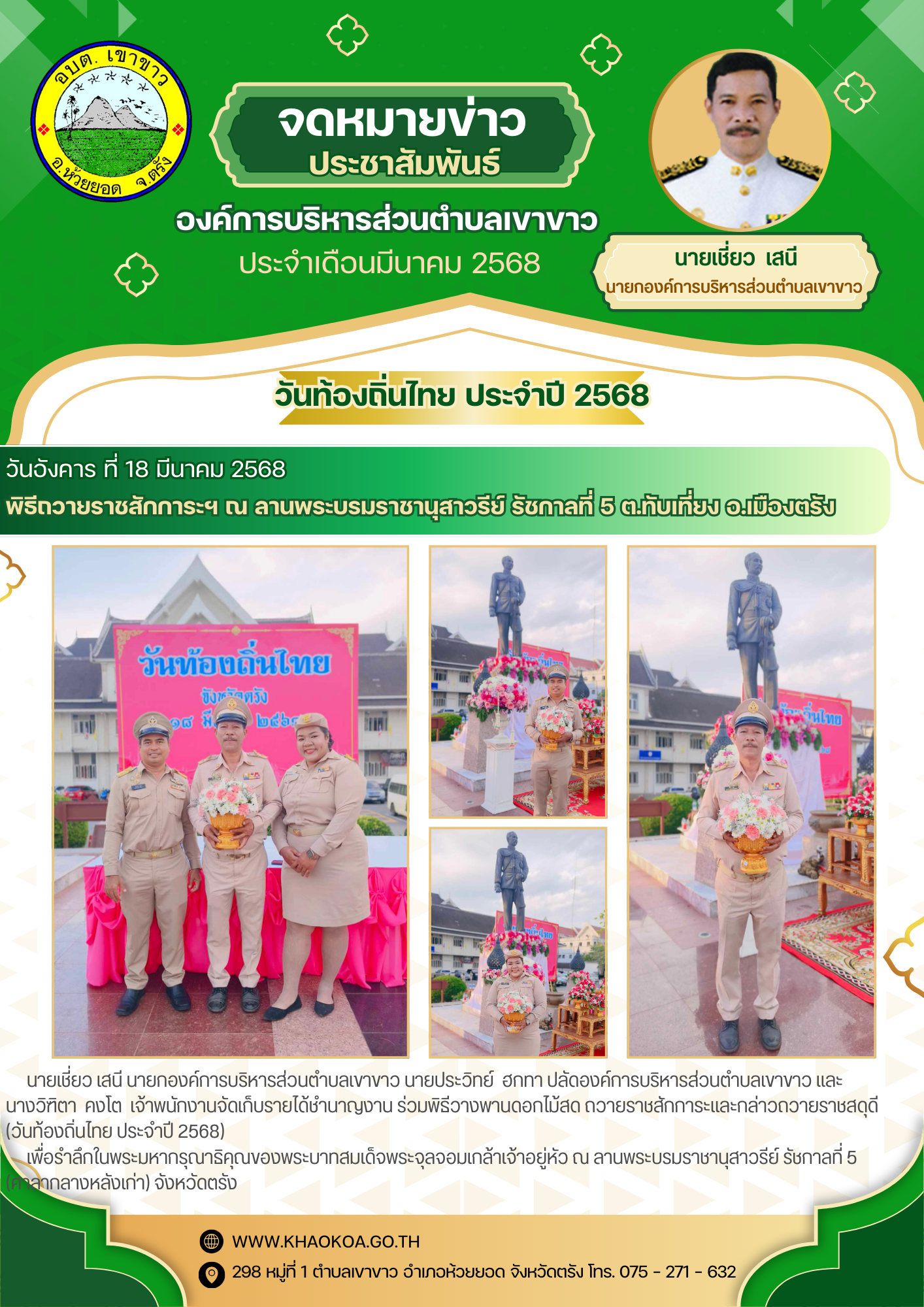 นายเชี่ยว เสนี นายกองค์การบริหารส่วนตำบลเขาขาว นายประวิทย์ ฮกทา ปลัดองค์การบริหารส่วนตำบลเขาขาว และนางวิฑิตา คงโต เจ้าพนักงานจัดเก็บรายได้ชำนาญงาน ร่วมพิธีวางพานดอกไม้สด ถวายราชสักการะและกล่าวถวายราชสดุดี (วันท้องถิ่นไทย ประจำปี 2568) เพื่อรำลึกในพระมหากรุณาธิคุณของพระบาทสมเด็จพระจุลจอมเกล้าเจ้าอยู่หัว ณ ลานพระบรมราชานุสาวรีย์ รัชกาลที่ 5 (ศาลากลางหลังเก่า) จังหวัดตรัง
