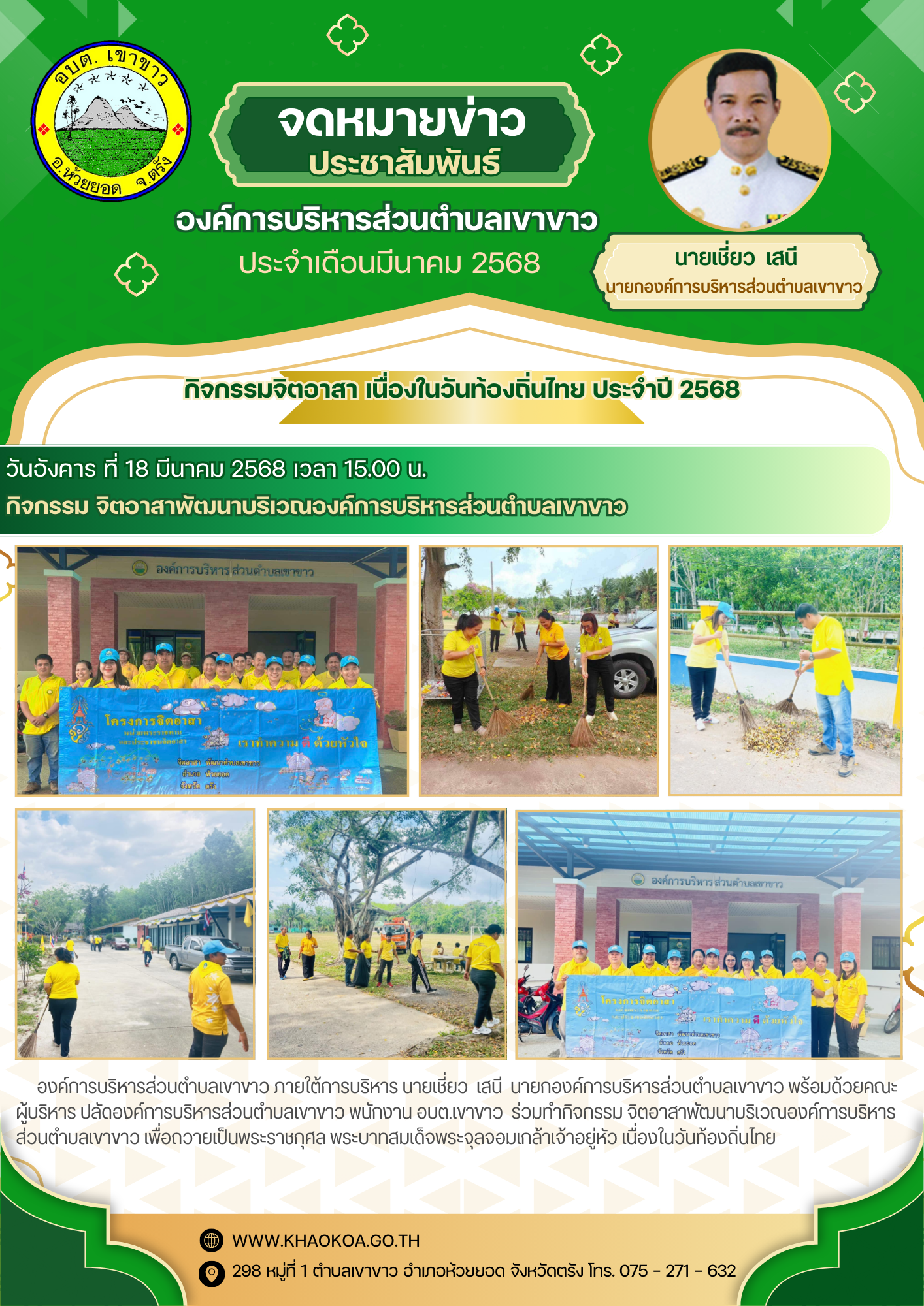 องค์การบริหารส่วนตำบลเขาขาว ภายใต้การบริหาร นายเชี่ยว เสนี นายกองค์การบริหารส่วนตำบลเขาขาว พร้อมด้วยคณะผู้บริหาร สมาชิก สภา อบต. ปลัดองค์การบริหารส่วนตำบลเขาขาว และพนักงาน อบต.เขาขาว ร่วมทำกิจกรรม จิตอาสาพัฒนาบริเวณองค์การบริหารส่วนตำบลเขาขาว เพื่อถวายเป็นพระราชกุศล พระบาทสมเด็จพระจุลจอมเกล้าเจ้าอยู่หัว เนื่องในวันท้องถิ่นไทย