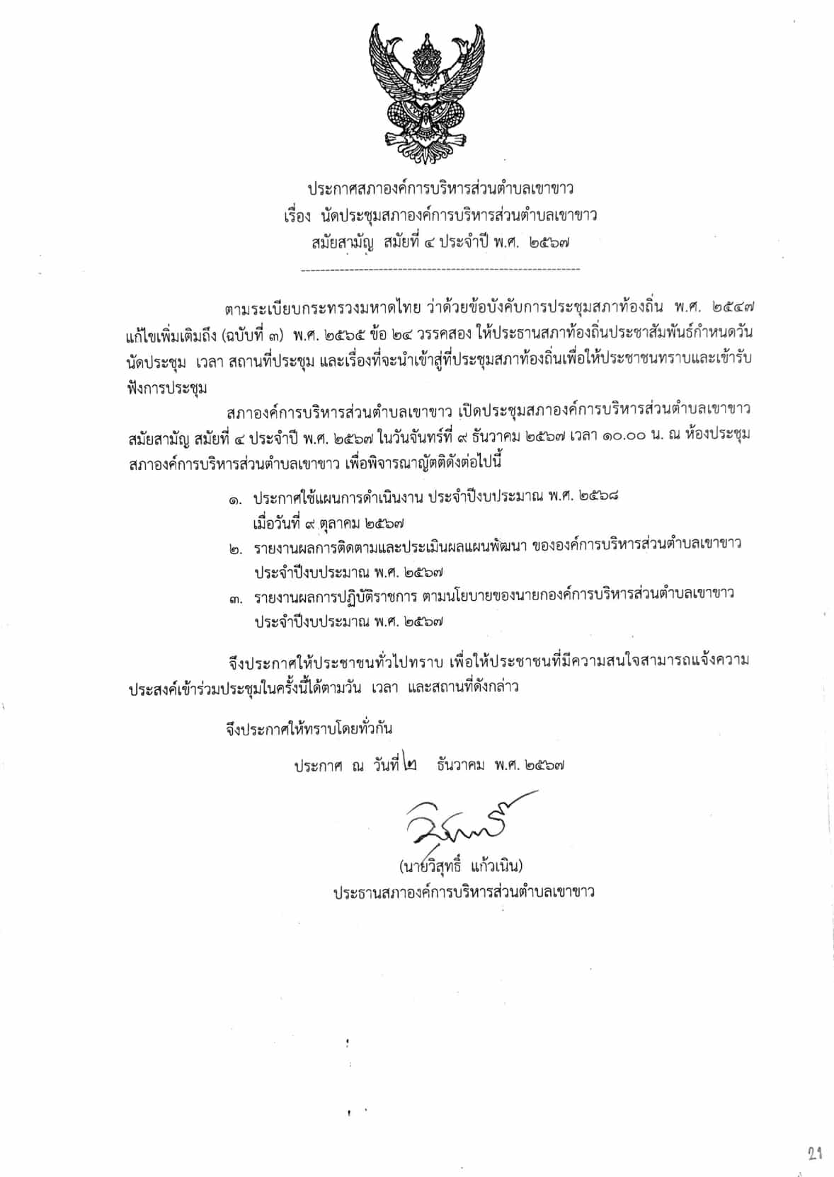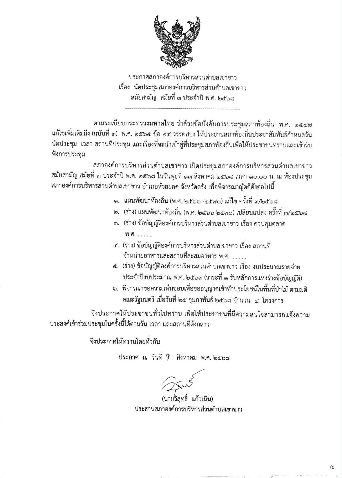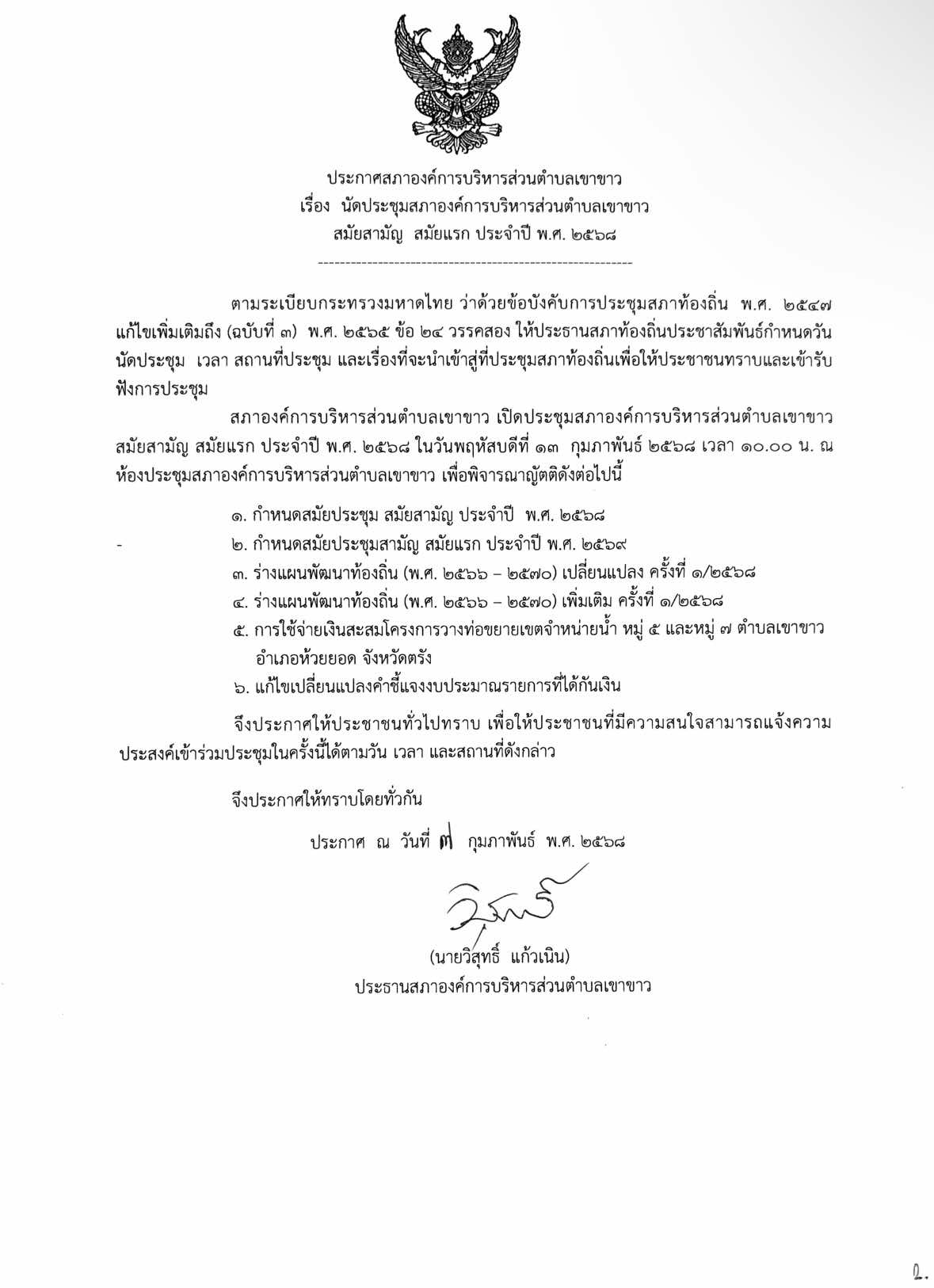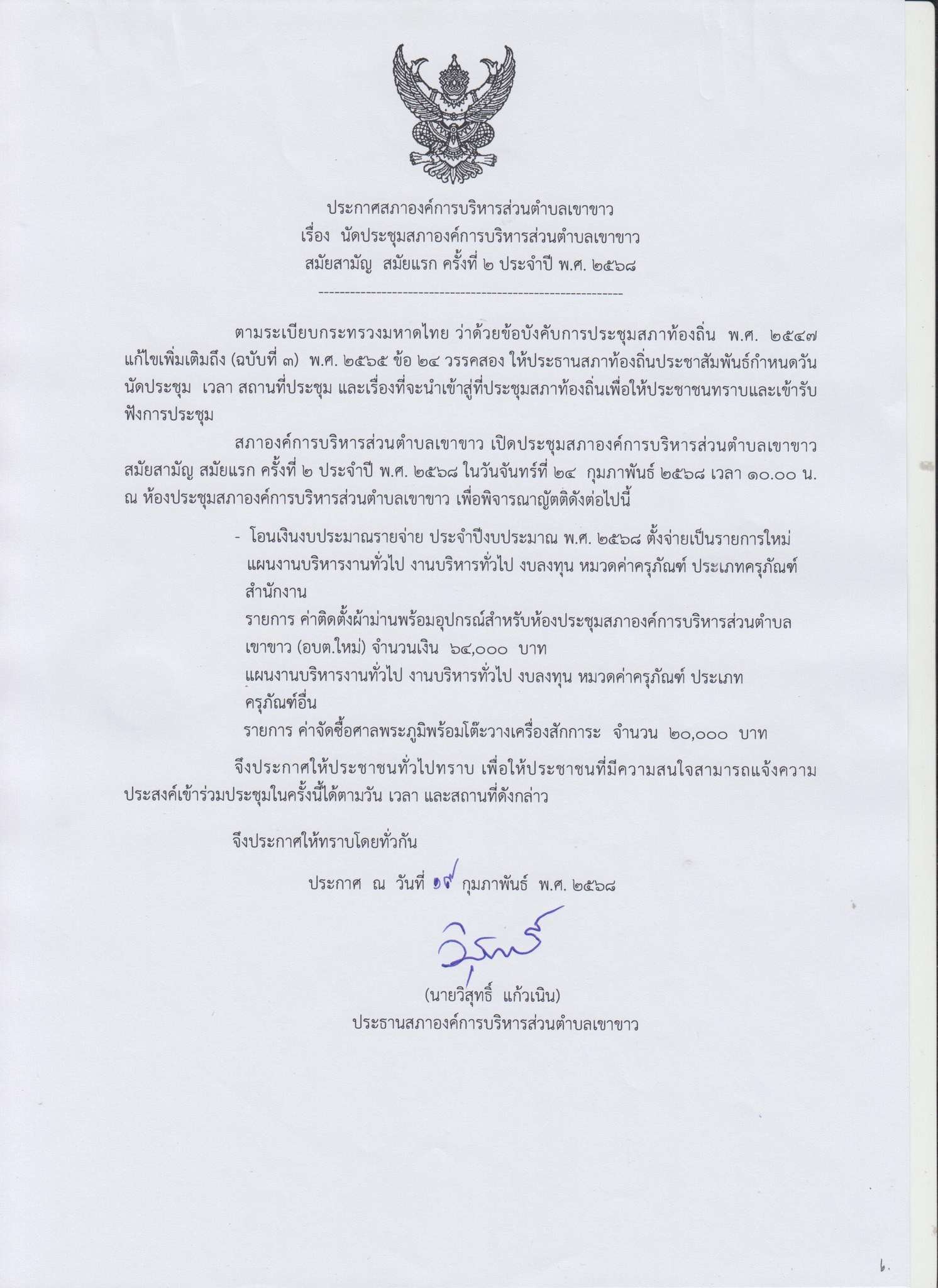 ประกาศนัดประชุมสภา อบต.เขาขาว ประจำปี พ.ศ.2568