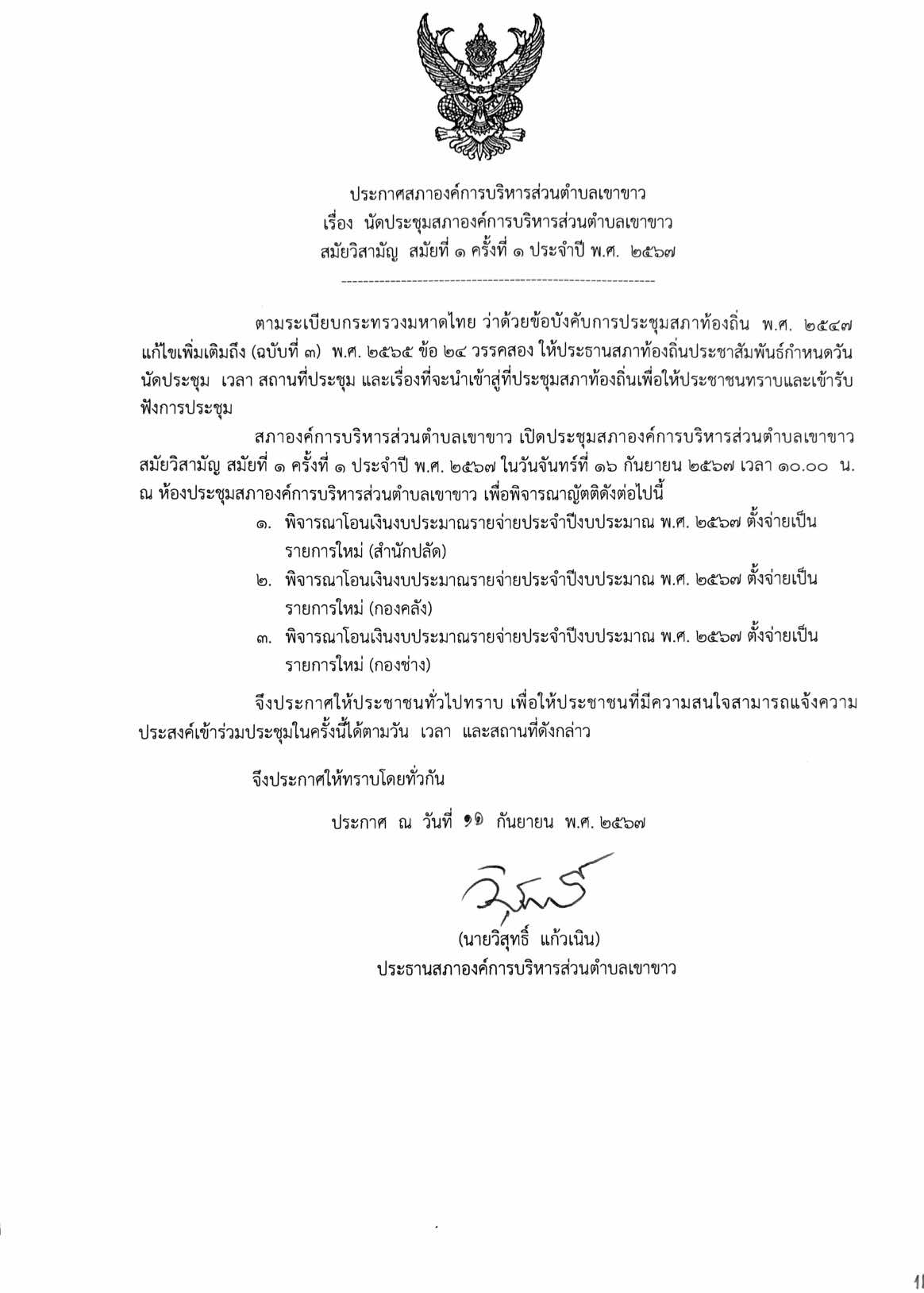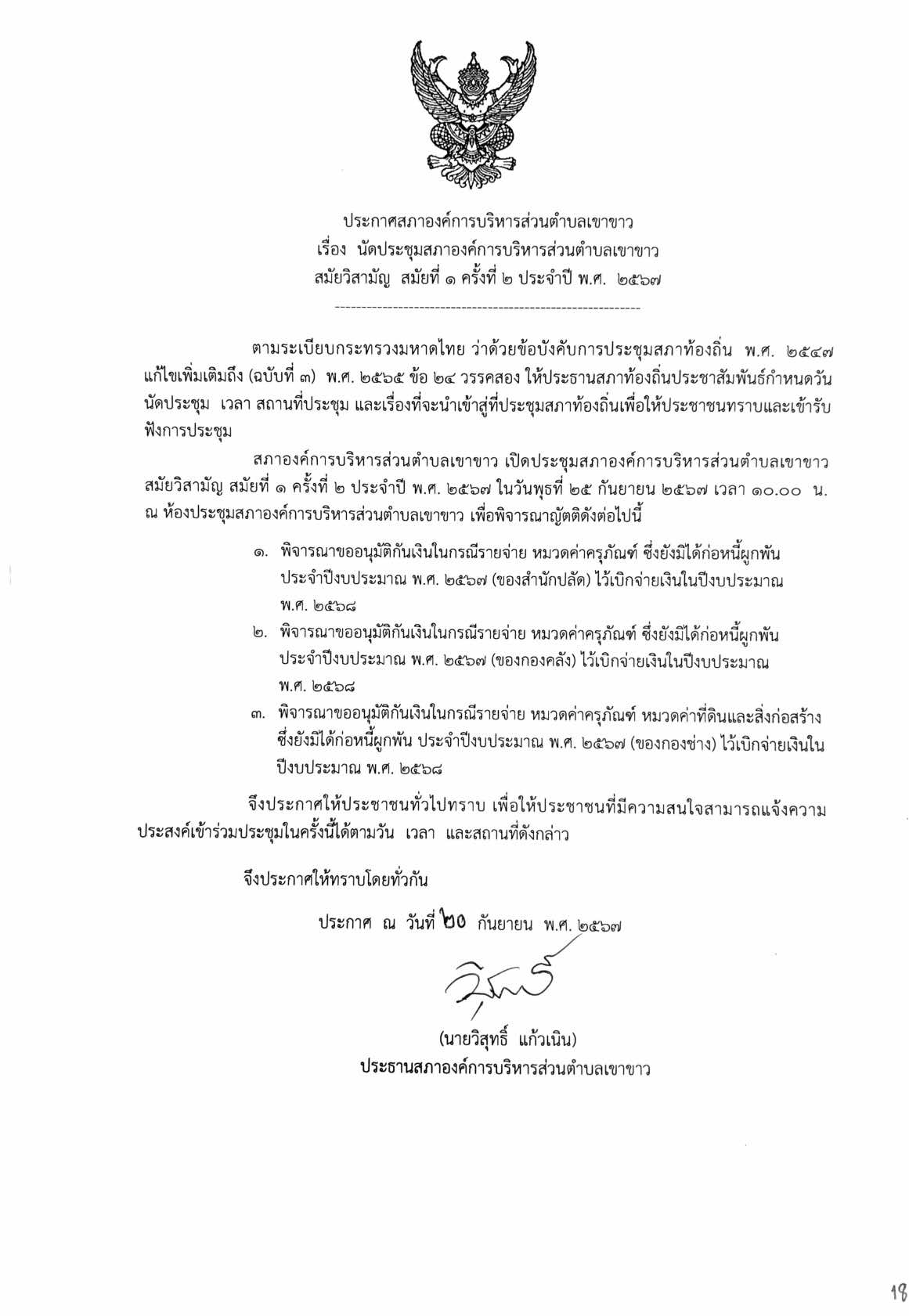 ประกาศนัดประชุมสภา อบต.เขาขาว ประจำปี พ.ศ.2567